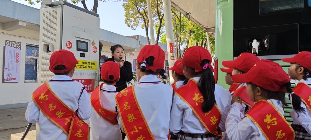 圖/在公交充電站,工作人員向同學(xué)們介紹充電樁的工作原理和純電動(dòng)公交車的運(yùn)行優(yōu)點(diǎn)。